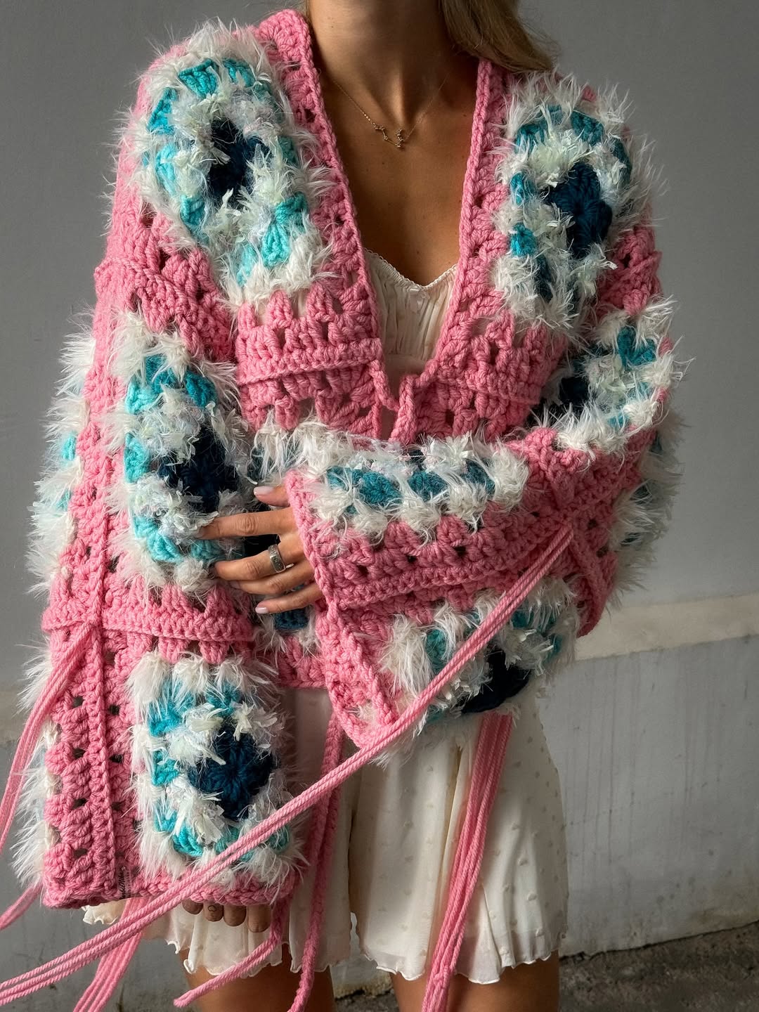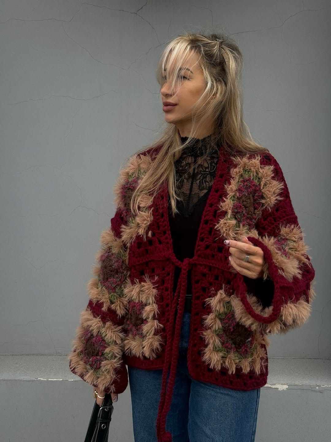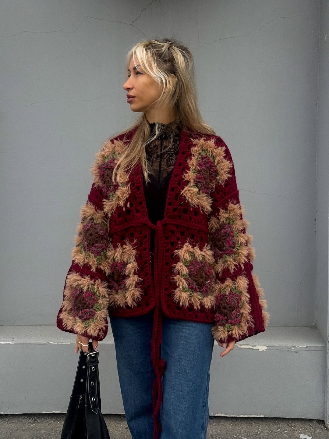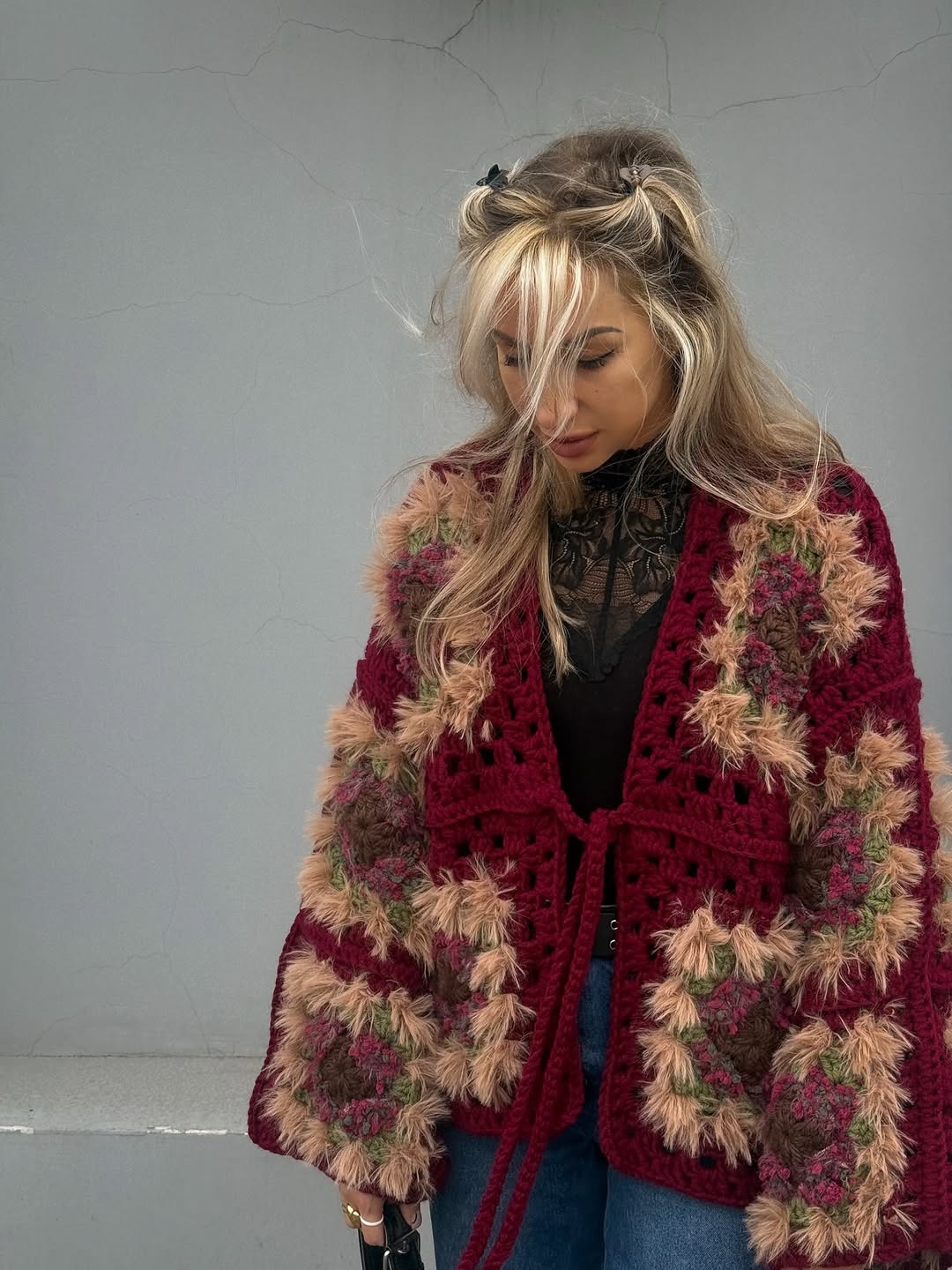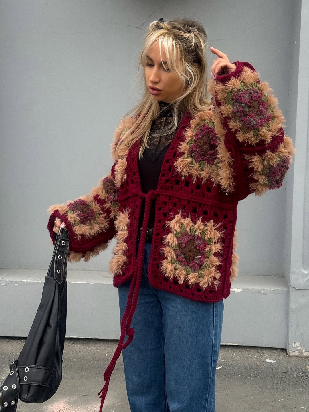 This design combines different yarn textures for a cozy, layered look — perfect for anyone who loves handmade comfort and natural, boho-inspired style.